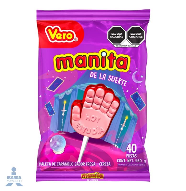 The “Manita de la Suerte” (Lucky Little Hand) lollipop is a classic and fun treat from Vero. This playful, hand-shaped lollipop delivers a sweet and satisfying cherry flavor that’s been loved for generations. Its fun shape makes it a hit with kids at any party.